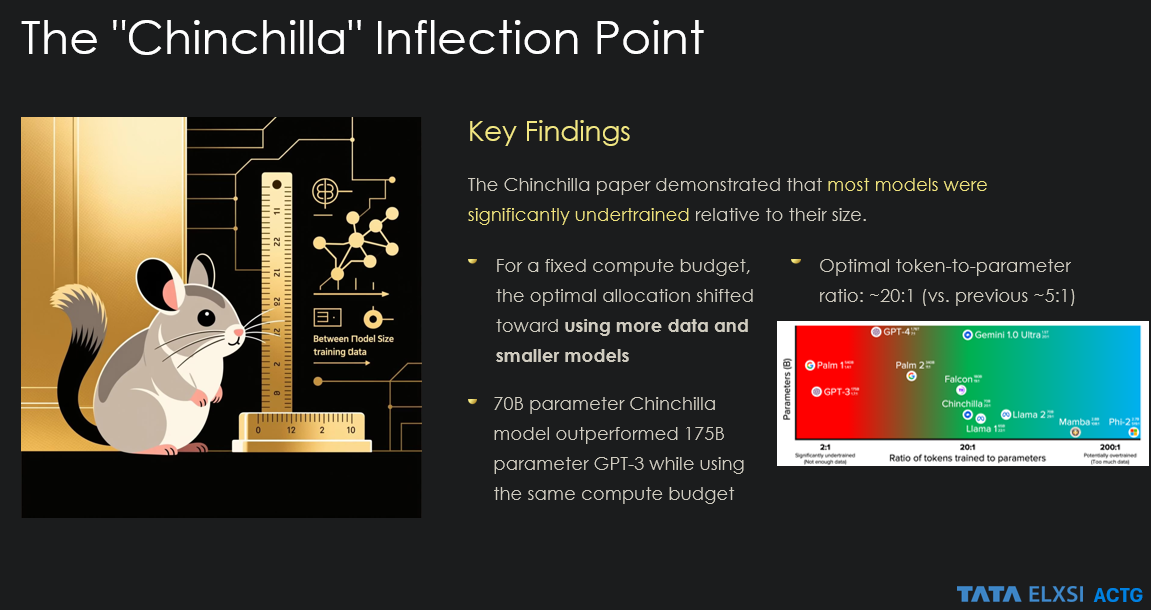 The power laws of generative AI, establishing that model size depends on input data size and compute budget, appeared to provide a reliable roadmap. Kaplan et al.’s scaling laws were effective, until everything changed. DeepMind’s Chinchilla model, four times smaller than the contemporary state-of-the-art Gopher yet achieving similar performance, shattered this approach. This “Chinchilla inflection point” exposed the limitations of pure scaling approaches.