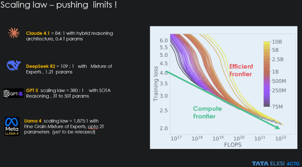 The scaling law methodology now faces challenges: constrained compute budgets, increasingly scarce high-quality data, sustainability concerns around energy-intensive GPUs, and geopolitical tensions affecting hardware access. These constraints have forced the field to innovate beyond traditional scaling. What began with Chinchilla’s modest 5:1 token-to-parameter balance has been radically transformed by breakthroughs in post-training scaling and inference. Modern architectures like Llama 4 and GPT-5 now operate at ratios of 1000:1, compressing vastly more knowledge into each parameter in a complex high dimensional space.